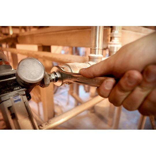 Kompakter, zuverlässiger metrischer Doppelmaulschlüssel, der präzises Arbeiten in beengten Bereichen ermöglicht. Der komfortable Griff sorgt für bessere Zugänglichkeit und zuverlässige Kraftübertragung bei Montage- und Wartungsarbeiten an 17 mm und 19 mm Schrauben.